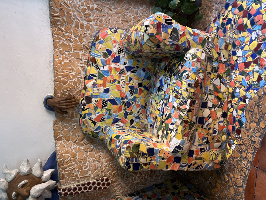 A tiled human-like figure, composed of irregularly shaped colorful pieces, is the focal point. This form is textured with various colors, including yellow, blue, red, and orange. The figure is set against a background made of broken ceramic tiles. A sculpted brown hand reaches out from a white wall, situated to the left of the tiled figure. Underneath, there is a head with white spikes. A touch of greenery is visible in the top right corner of the frame.