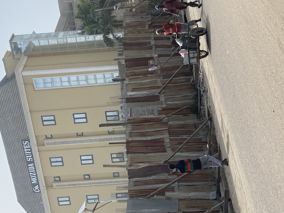 The scene is located in Sabon Gari West, Nigeria. A multi-story hotel building, "MOZIDA SUITES," with a light yellow facade, dark-framed windows, and a glass-enclosed exterior elevator shaft, occupies the background. Its roof is dark-tiled. In front of the hotel, a construction site is delineated by a barrier fence composed of vertically oriented, rusted and galvanized corrugated metal sheets supported by angled wooden planks. The ground immediately behind this fence reveals construction elements like concrete blocks. A paved asphalt road occupies the foreground. Three male individuals are visible. On the left, one man stands facing away from the viewer, wearing a dark shirt with horizontal red, green, and black stripes, and light-colored pants. He is positioned near the corrugated fence. On the right side of the road, two men are in motion. One man, wearing a red shirt and a white head covering, pushes a two-wheeled metal cart laden with various objects, including white containers. Beside him, a second man walks, wearing a long, reddish-brown tunic. The scene is illuminated by bright daylight, casting visible shadows.