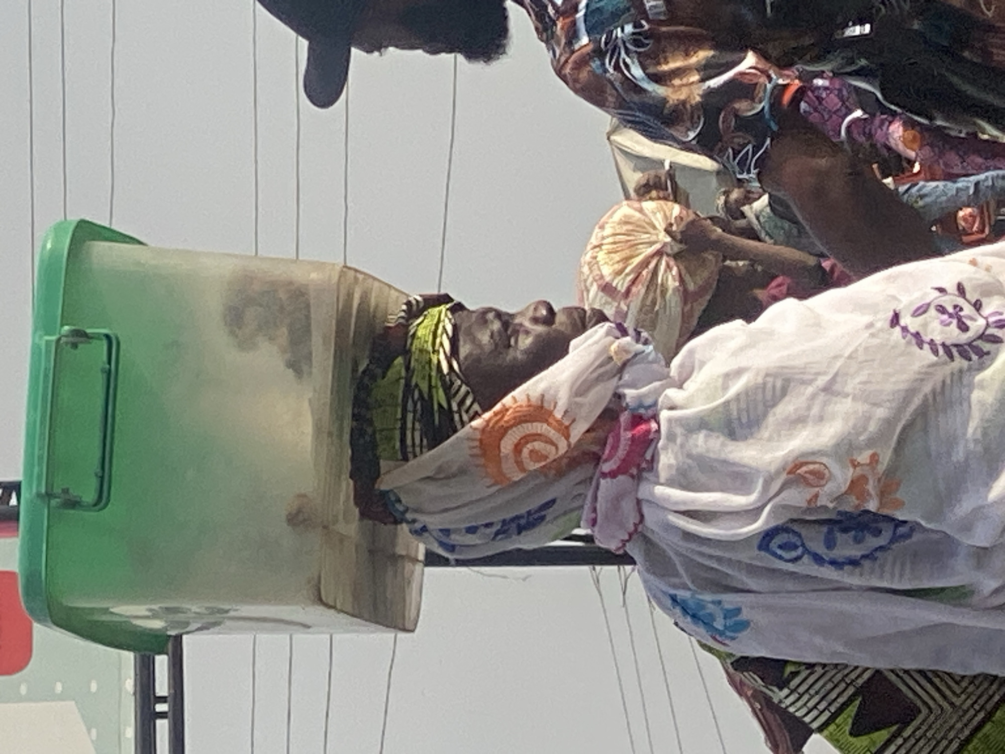 The image displays an outdoor urban scene in Ibadan, Nigeria, capturing a moment in a market or street environment under bright daylight