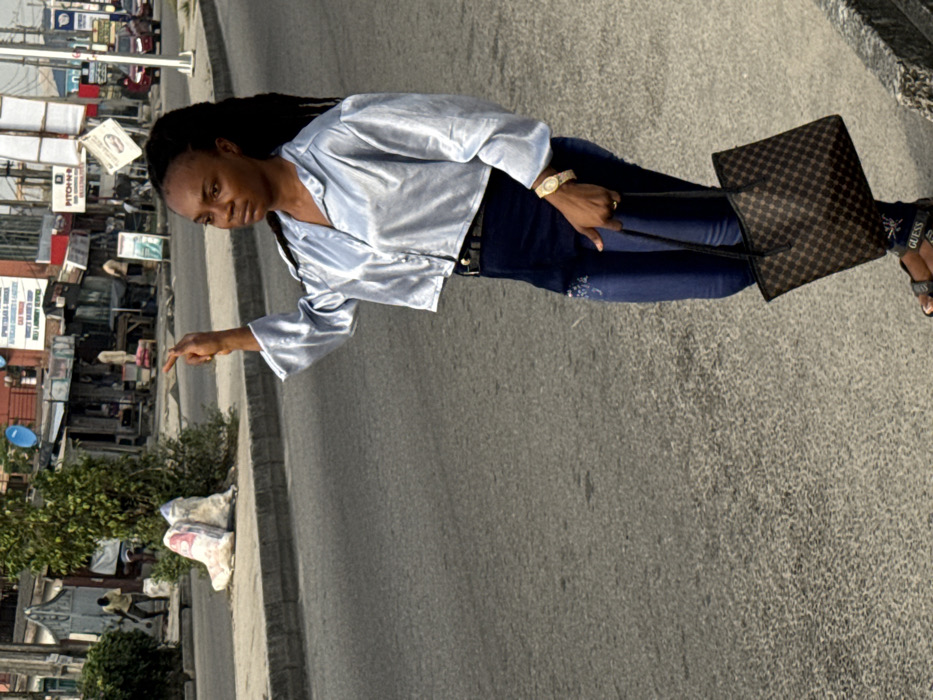A woman standing on a street, possibly pointing at something. She wears a silver blouse, dark jeans, and black sandals with "Guess" visible on the strap. She also has a watch and a checkered handbag. The background shows a street scene with buildings, signs, and some trash bags near a green bush. The perspective appears rotated, making the image appear sideways.