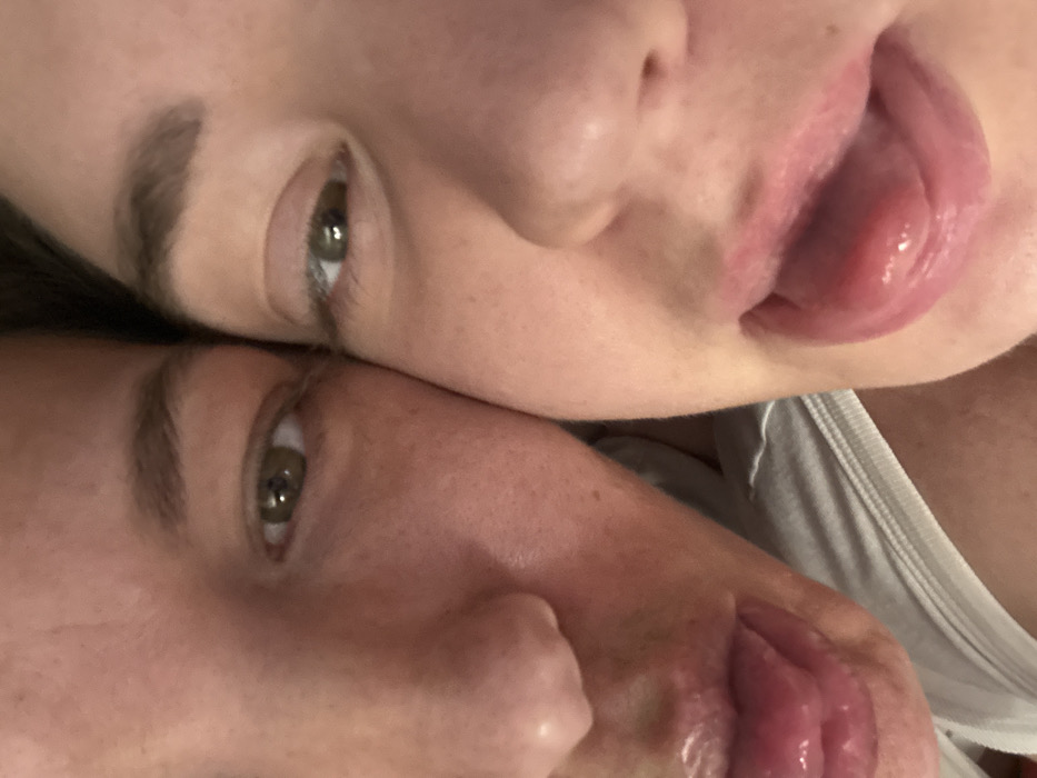 A close-up, vertically oriented photograph taken in Yakhroma, Russia, depicts two individuals' faces pressed together, predominantly showing their right sides. The individual on the left has fair to medium skin with some visible pores and minor blemishes or freckles on the right cheek. Their right eye, with a dark iris, is open and directed towards the viewer. The right side of their nose is visible, and their mouth is open with a pink, glossy tongue extended forward. A segment of a white, possibly ribbed, garment is visible below their chin on the lower left. The individual on the right, whose face is pressed against the left individual's, also has fair to medium skin. Their left eye, with a dark iris, is partially visible and open, directed towards the viewer. The left side of their nose is discernible, and their mouth is open with a pink, glossy tongue extended forward. Both individuals share a similar facial expression. The background is dark and out of focus, indicating an indoor setting with low light conditions.