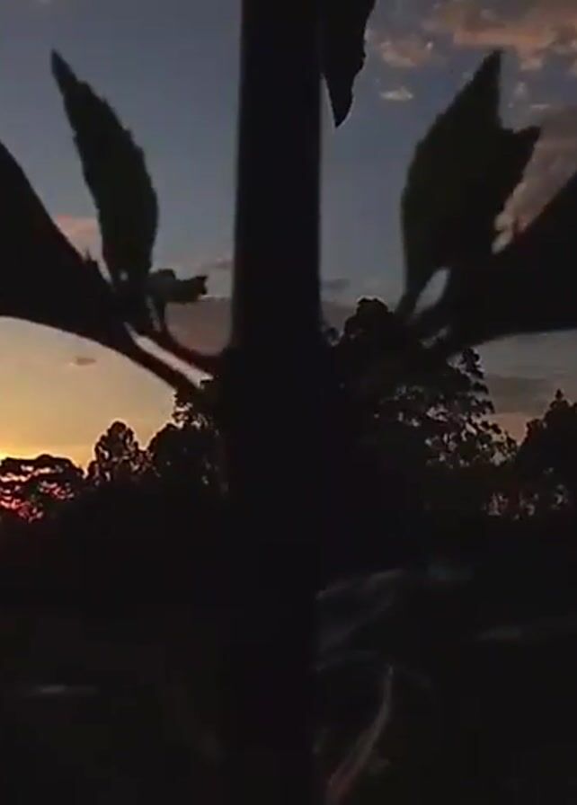 close-up shot of plants against a sunset background. The foreground consists of dark, silhouetted leaves and a stem, partially obscuring the view. Through the gaps, a vibrant sunset is visible with orange and yellow hues near the horizon, fading into a blue sky with light, wispy clouds. Silhouettes of trees fill the background. The camera slightly adjusts its position, changing the perspective of the foreground plants against the setting sun.