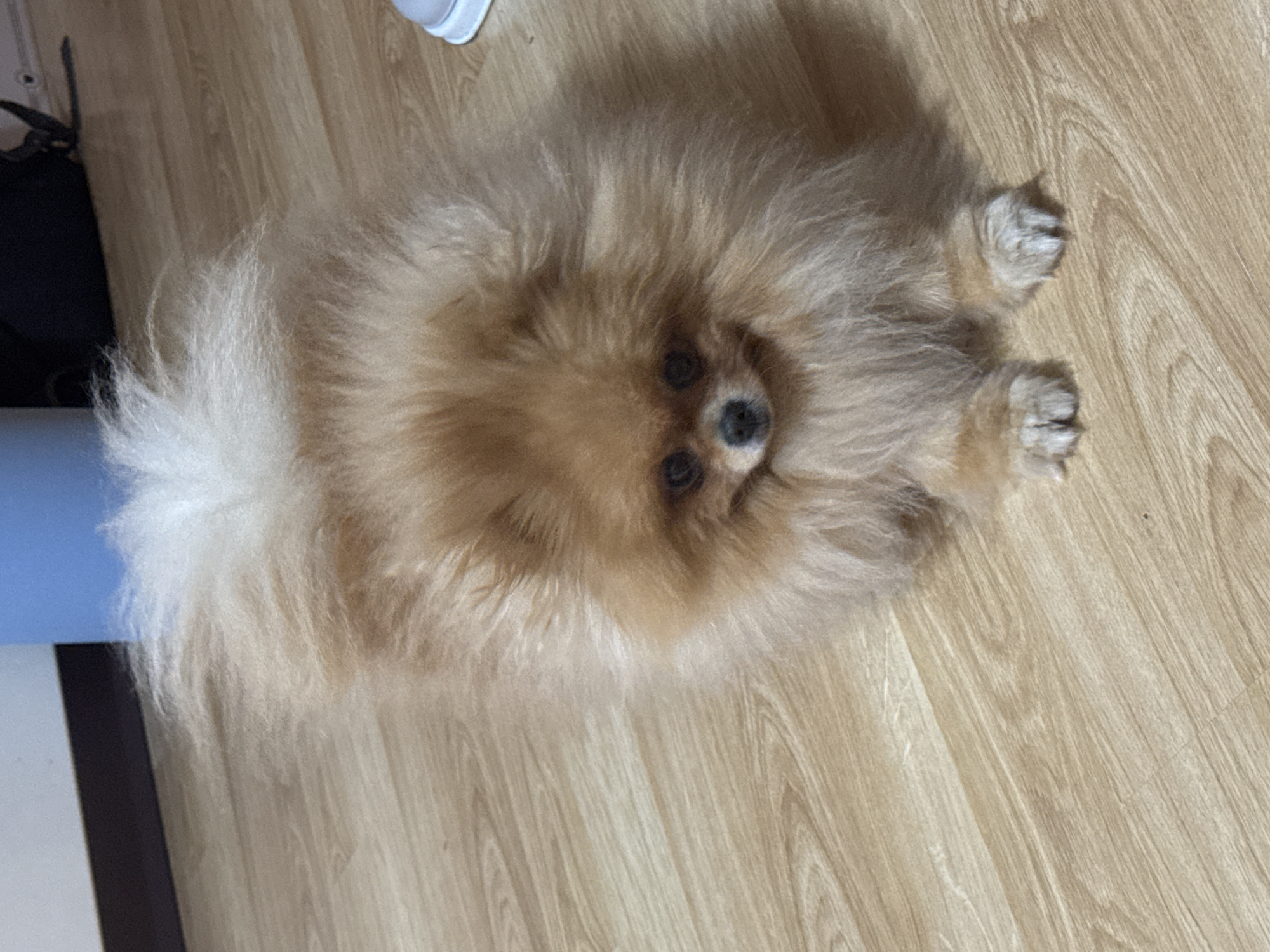 - "A fluffy, small, light brown dog, likely a Pomeranian, lies on a light-colored wooden floor with its head facing the camera" by FM-rJ28s2, licensed under CC BY 4.0
