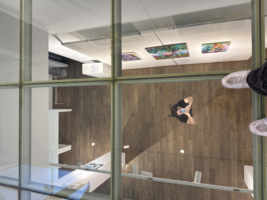 An overhead photograph captured from a glass floor reveals a modern art gallery or exhibition space below