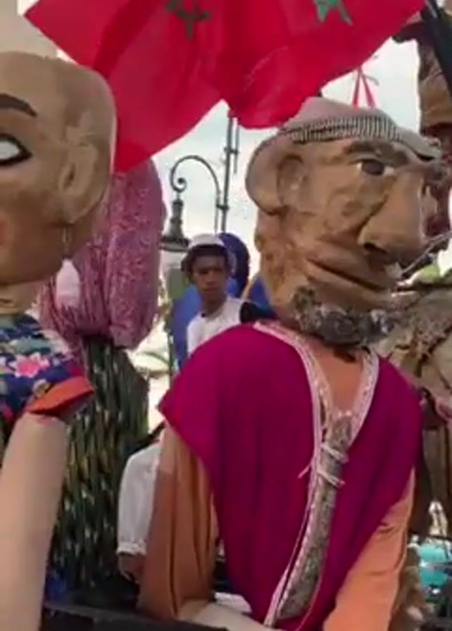 parade float moving down a street. On the float, there are large, somewhat grotesque puppets of a man and a woman. The float also features a model camel with a person dressed in military-style clothing standing on top and waving a Moroccan flag. There are two other Moroccan flags behind the puppets. Several people are visible around the float, including a child who briefly appears to run next to it. The background includes buildings and a cloudy sky.