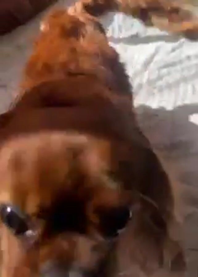 A small, brown King Charles spaniel is featured in a short video. The dog initially shakes itself vigorously while standing on a patterned white and grey bedsheet. It then approaches the camera, sniffing, before turning its head to the side. The environment includes a bed and some furniture in the background, including what appears to be a turquoise object.