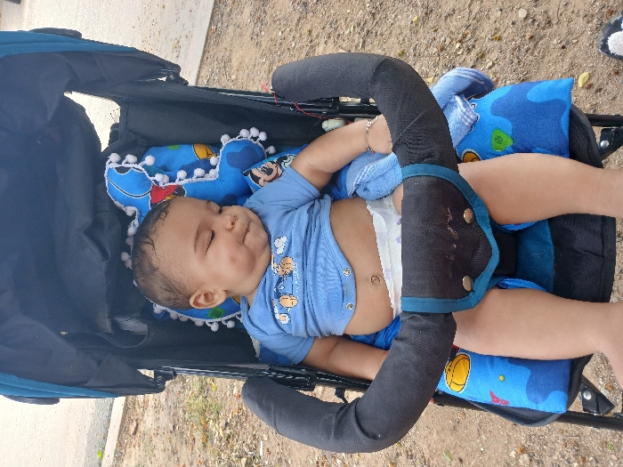 - "A baby in a blue onesie, with a diaper visible, lies in a black stroller lined with blue patterned fabric" by FM-XSA4R2, licensed under CC BY 4.0