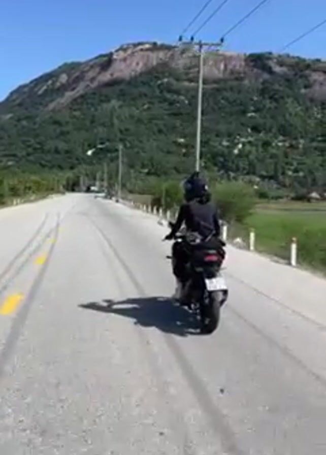 A person in dark clothing and a helmet is riding a black motorcycle down a paved road. The road has yellow lines down the center and white markers on the sides. There is a large, green mountain in the background under a clear blue sky. As the motorcycle moves forward, it leaves the frame. A couple of vehicles and a group of people can be seen in the distance, further down the road. Powerlines run above the road. Rice paddies are visible on the right side of the road.