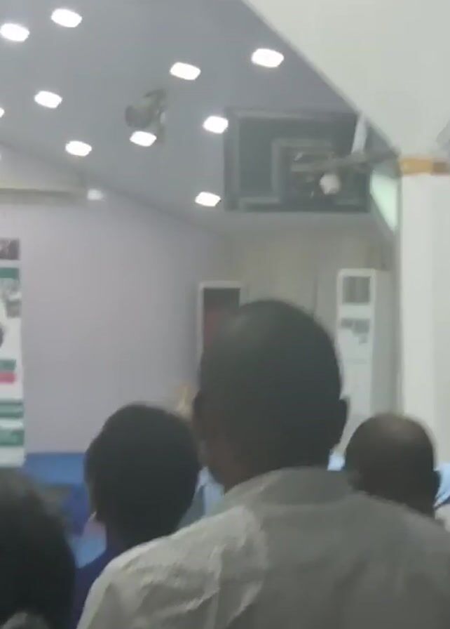 group of people gathered in a room. The room has a dropped ceiling with recessed lighting. A poster is visible on the left wall. The camera moves, revealing more of the room and the people in attendance. An air conditioning unit and a large speaker are visible. The people are dressed in casual clothing. The video appears to be taken from the back of the room, focusing on the people listening to something happening in the front.