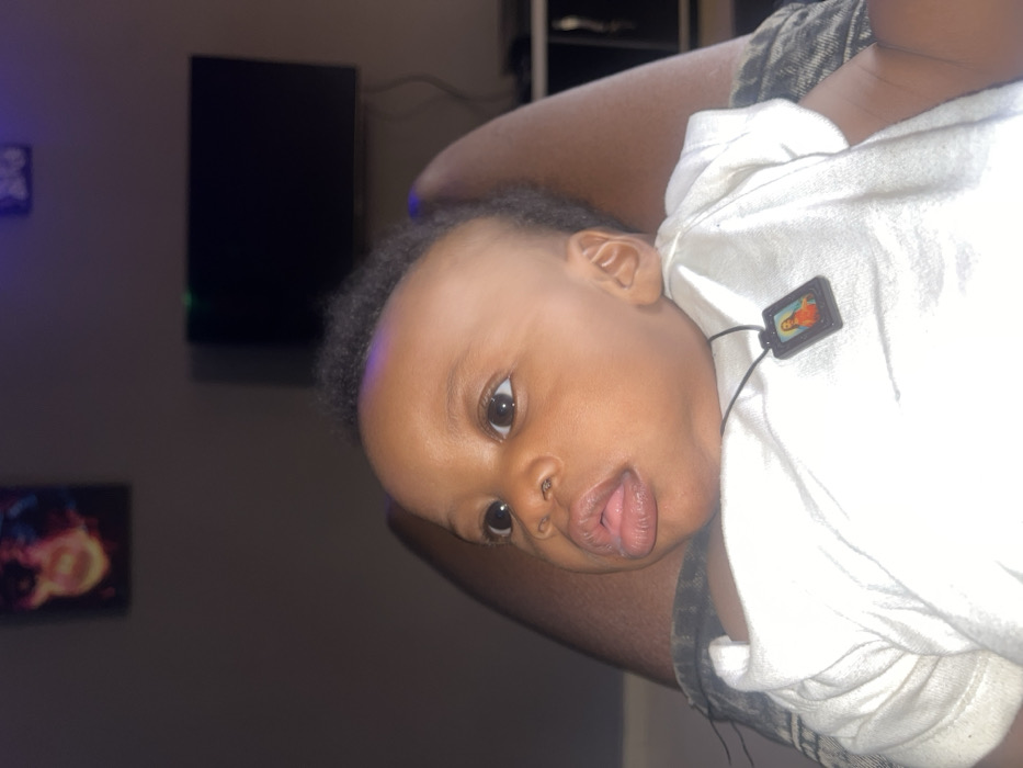 A baby with dark skin, black hair, and brown eyes is being held. The baby is wearing a white shirt with a small rectangular pendant hanging on the chest. The baby has a slightly open mouth, revealing the tongue. In the background, there's a dark wall with a TV mounted on it. There's also a glimpse of a shelf unit. The person holding the baby has dark skin and is wearing a shirt with a gray and black pattern.
