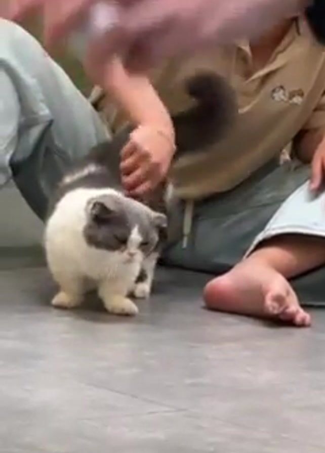 A young woman with glasses and wearing a tan polo shirt and blue jeans sits barefoot on a gray floor. She pets a short-legged, bicolor white and gray cat. The cat appears grumpy as the woman pets it on its back and head.