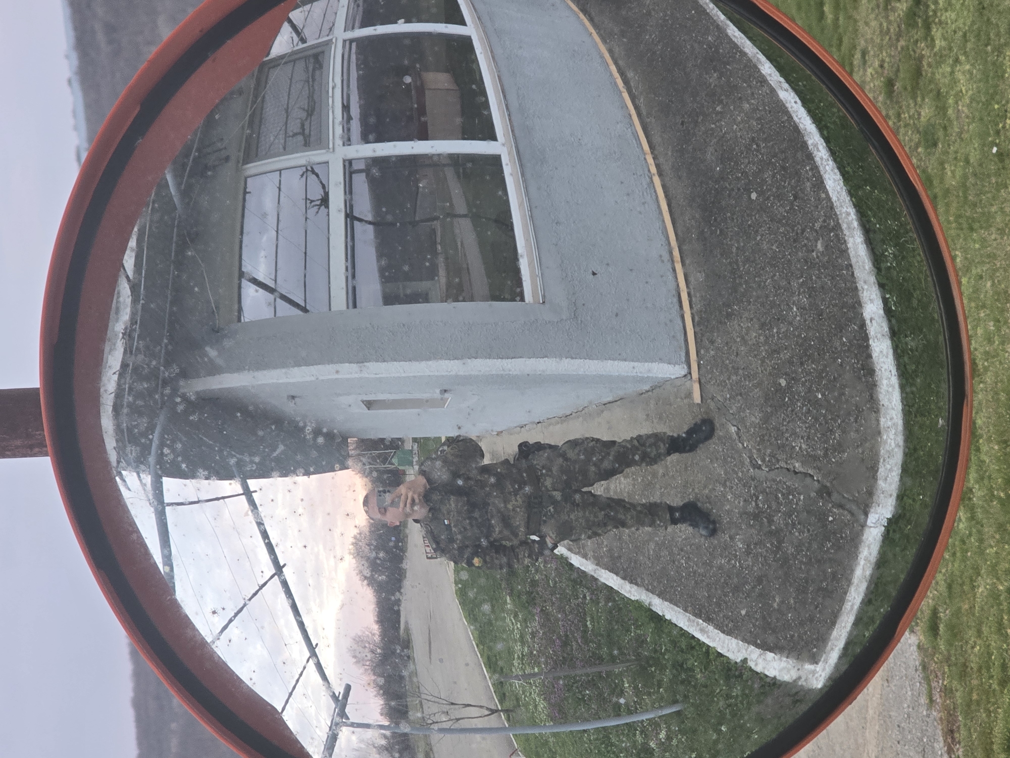 The image displays the reflection of a male individual in a circular convex security mirror with an orange perimeter, located in Beliakovets, Bulgaria. The mirror's surface is noticeably dirty with numerous spots and streaks. The man, positioned centrally in the reflection, is wearing a full camouflage military uniform, including boots. A patch resembling the Bulgarian flag is visible on his left shoulder. He holds a dark-colored smartphone directly in front of his face, indicating he is taking a selfie. A dark object, possibly a holster or pouch, is visible on his right hip. He stands on an asphalt surface, possibly a pathway or parking area, which features a white painted line along its edge. To the left of the path, a patch of green grass with small purple flowers is visible. Directly behind the man and to his right, a light gray, single-story building with a large multi-paned window section is reflected. The window reflects a cloudy sky and bare tree branches. In the background, beyond the immediate paved area, bare trees, a dirt/gravel expanse, and distant hills are visible under a soft, diffused sky. A rudimentary overhead structure with wires is also reflected above the man.