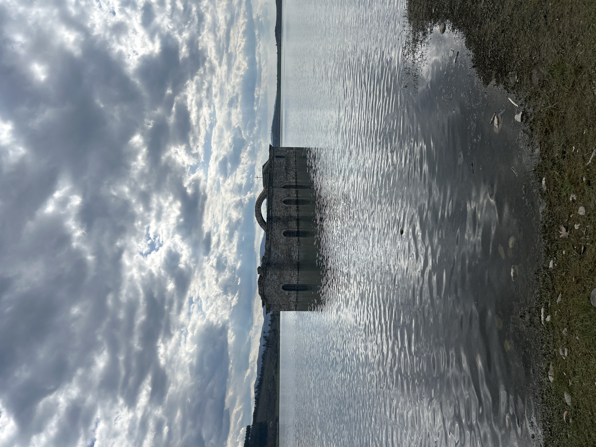 partially submerged ruins of a stone building with arched windows, likely a church, standing in a body of water
