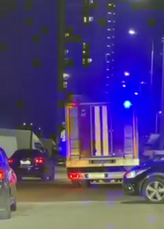 At night, several vehicles are at a standstill on a road next to a tall building with illuminated windows. A fire truck with flashing blue lights is facing the camera. Street lights are visible.