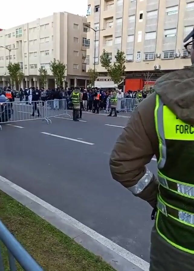 A medium-wide shot shows a street scene, seemingly in a city, with several people and barriers set up along the road. In the foreground and to the right of the frame stands a person, seen from the back, wearing a dark green jacket and a high-visibility yellow and reflective vest with “FORCES AUXILIAIRES” printed on the back. They are also wearing a dark cap and glasses. The camera follows this person as they move past metal barriers and a group of people standing behind them. The group consists of men and boys, some wearing jackets and others in sports attire. There are officers standing among the crowd, with orange vests over their uniforms. In the background, there is a multi-story building in a light tan color. A police van is visible in the background as well. The sky is overcast.