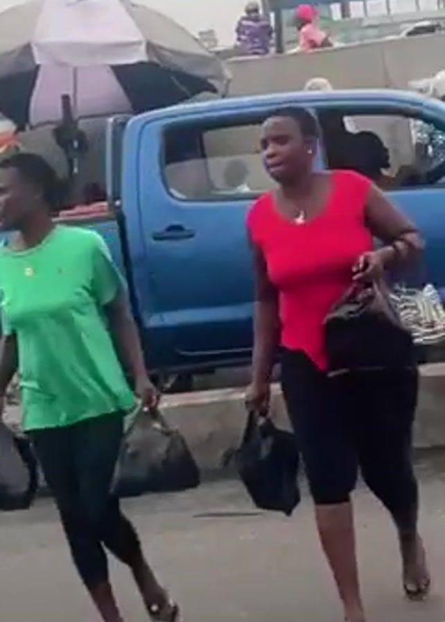 street scene with people, vehicles, and activity. There is a blue pickup truck parked near a low concrete barrier. People are standing and walking near the truck. One man carries a large white bag on his head. A yellow van is also present. People are dressed in various clothing styles. The environment appears to be urban with buildings, power lines, and overhead structures visible. The sky is overcast.