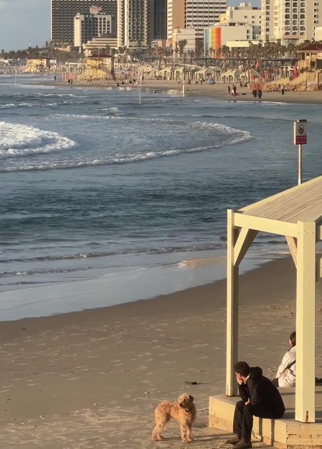 beach scene. The ocean waves crash against the shore, and in the background, there is a cityscape of tall buildings. On the right side of the frame, there is a white wooden structure with two people sitting inside. One person is in the foreground wearing a black jacket and appears to be looking out at the sea. The other person is sitting behind them and is partially obscured. In front of the wooden structure, a medium-sized dog is standing on the sand, looking towards the people. There are people walking along the beach in the distance. The lighting indicates it is either early morning or late afternoon.