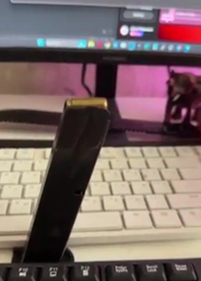 A black firearm magazine stands vertically between the rows of keys on two adjacent computer keyboards