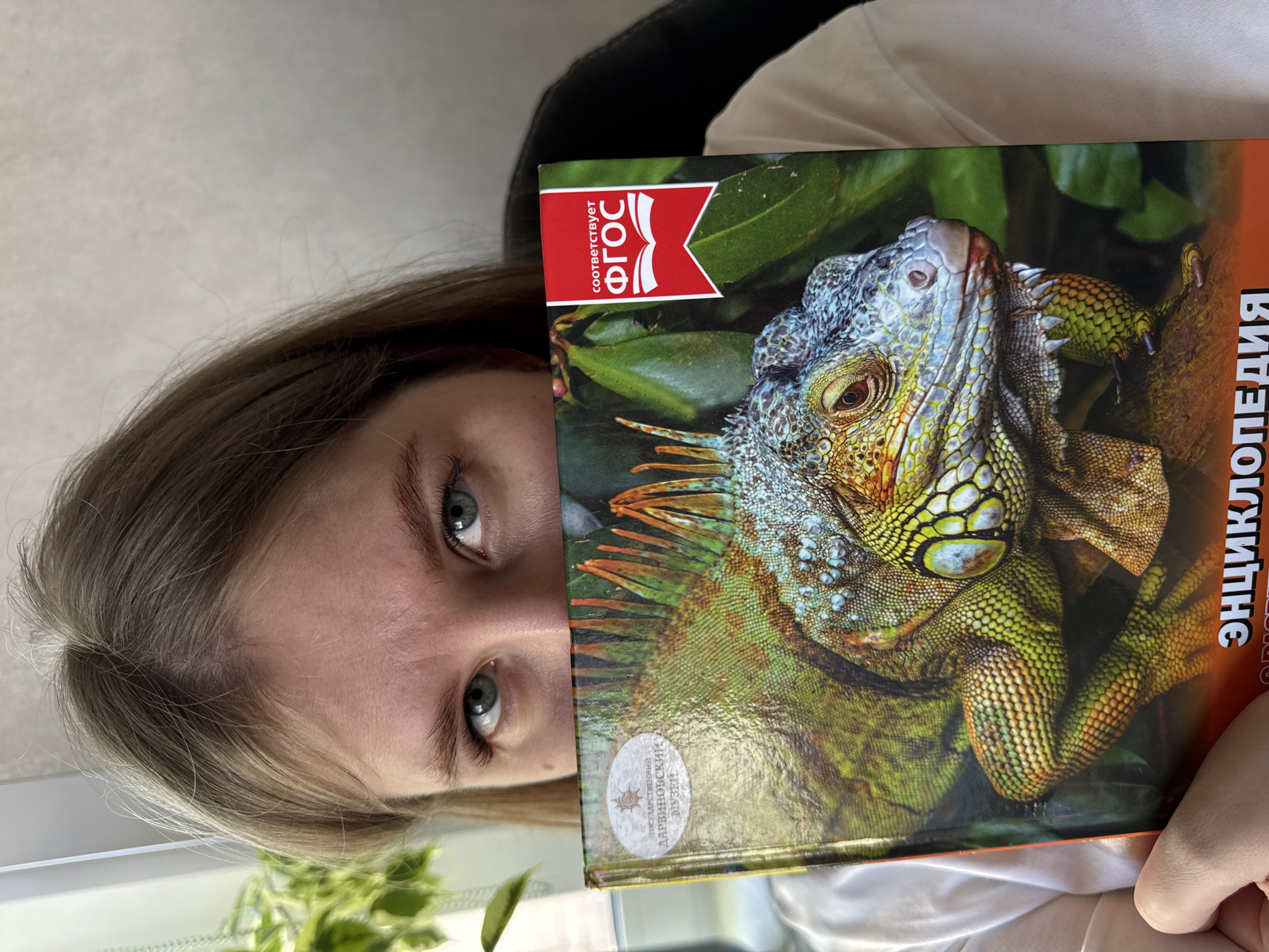 A young person with light brown hair and blue eyes is partially obscured by a book. The book's cover features a large iguana and the words "ЭНЦИКЛОПЕДИЯ" written vertically in Russian, along with a red logo in the upper left corner with Cyrillic text: "соответствует ФГОС". A small sticker is present on the lower left corner of the book with the text "ГОСУДАРСТВЕННЫЙ ДАРВИНОВСКИЙ МУЗЕЙ". The person is holding the book in front of their face, with only their eyes and a portion of their hair visible. The background is blurred, but hints of a window, a green plant, and a black chair can be seen. The location is potentially Gornyi (Dvurechenskoe S/P), Russia.