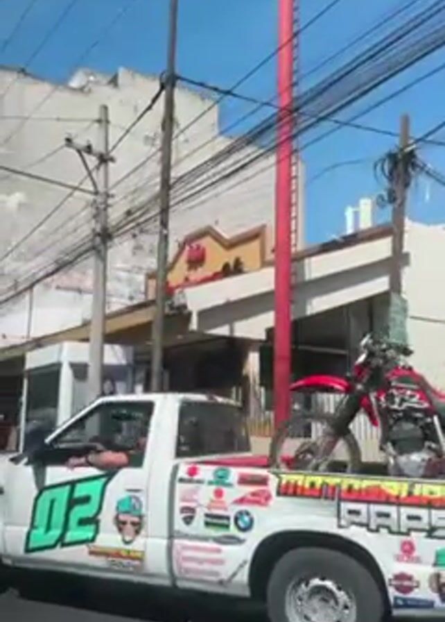 The camera, looking out the side of a moving car, captures a white pickup truck driving down a city street. The truck is adorned with numerous stickers and graphics, including the number "02," a cartoon monkey face, and the phrase "MOTOGARAGE PAPS" in bold letters. In the truck bed, a red and white dirt bike is securely fastened. Overhead, there's a clear blue sky crisscrossed by numerous power lines and utility poles. Buildings line the street, with a red and yellow restaurant sign visible in the background. A man is driving the pickup truck.