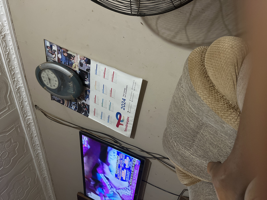 wall with various items mounted on it. There is an analog clock next to a 2024 Total Energies calendar. Below, a television screen displays content with the words "GREAT POWER MINISTRY" and other text. A partially visible ceiling fan is at the top, and a couch, featuring a textured beige and gray pattern, occupies a portion of the right side. The overall composition is somewhat skewed and contains visual clutter.