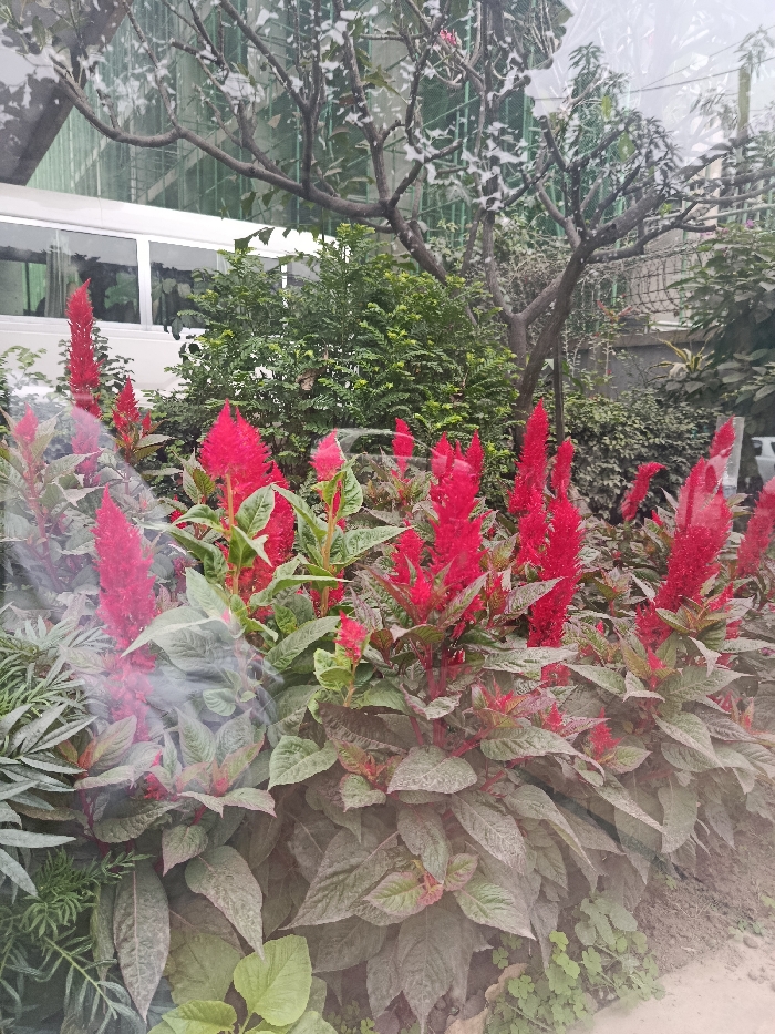 The image depicts an outdoor garden scene within an urban area of Dhaka, Bangladesh, viewed through a slightly reflective or hazy surface. The foreground is dominated by a dense bed of numerous tall, vibrant red, plume-like flowers, consistent with Celosia species, featuring green and reddish-green foliage. Behind this floral arrangement, various green shrubs and smaller plants are visible. A deciduous tree with numerous dark, bare branches stands in the midground to the right. In the background, a portion of a white vehicle, possibly a van or bus, is partially discernible to the left, behind the foliage. To the right, a grey concrete wall or fence topped with a security barrier, resembling barbed wire, is visible. Further into the background, parts of a building or structure with a green, mesh-like exterior are partially visible through the tree canopy. No individuals are present in the scene, and no specific actions or interactions are occurring. The ground beneath the plants consists of exposed soil and sparse green ground cover.