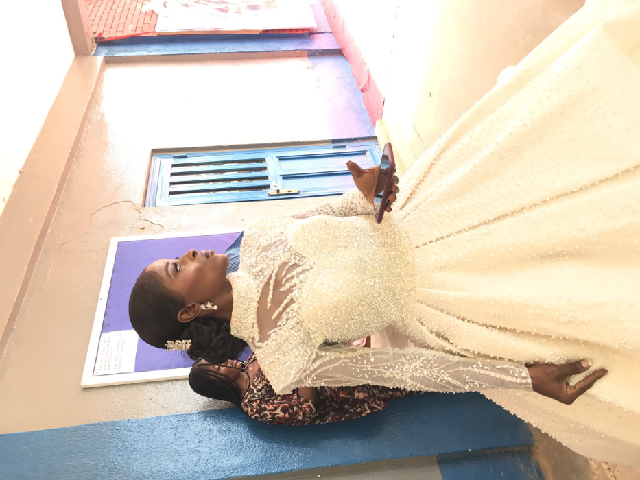 - "An adult female in a white, heavily beaded, long-sleeved gown with a high neck and full skirt stands in a corridor in Barakin Lerawi, Nigeria" by FM-aEPmy2, licensed under CC BY 4.0