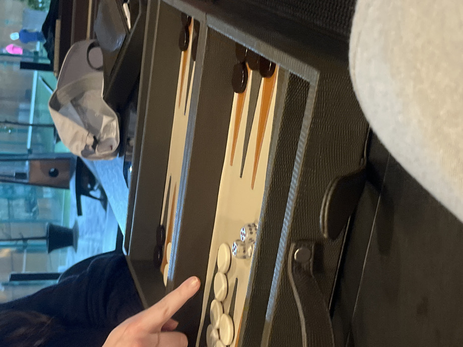 A backgammon board is open, showcasing the game in progress