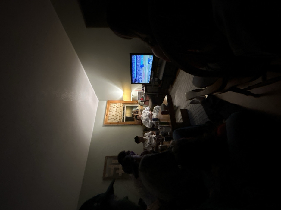 The image displays a dimly lit indoor scene within a living room in Kingston, Canada
