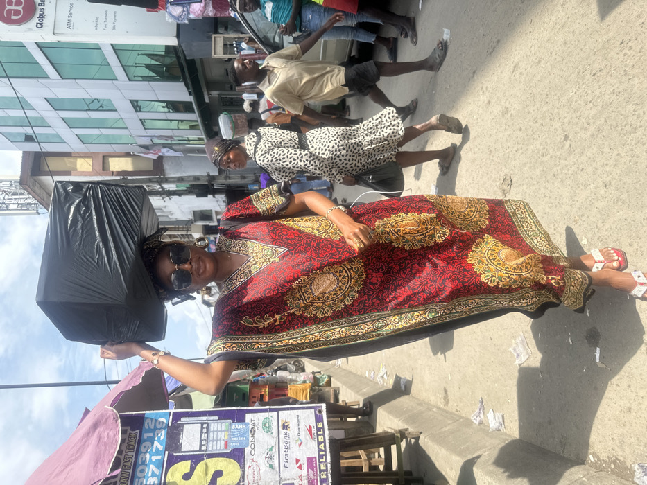 The image captures a vibrant street scene in a bustling commercial area of Lagos, Nigeria