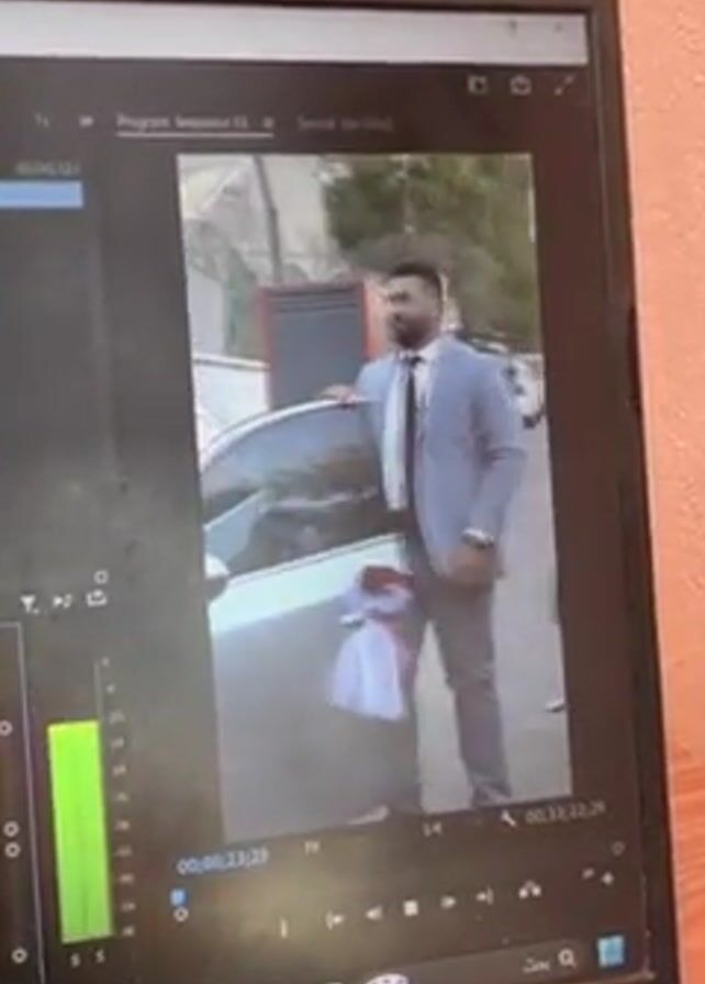 laptop screen displaying video editing software, likely Adobe Premiere Pro. The program shows a frame of a man in a grey suit standing next to a car decorated with a white ribbon. The man is adjusting his tie and looking towards the camera. The background shows a street with parked cars. The screen shows the timeline and audio levels of the video project. The environment appears to be indoors, with a wooden surface below the laptop and a light pink wall in the background.