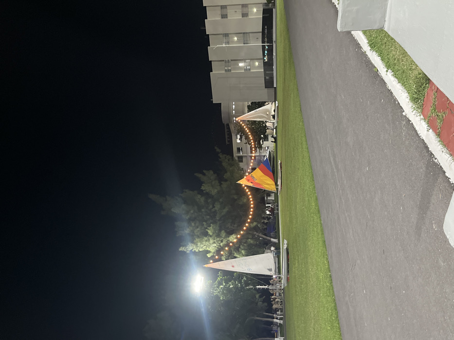 The image captures a nighttime scene on the grounds of an educational institution, identified by a building sign reading "NAVIGACIÓN Y CIENCIA" (Navigation and Science). This location is consistent with the Heroica Escuela Naval Militar in Antón Lizardo, within the Veracruz metropolitan area, Mexico. In the foreground, a dark asphalt pathway traverses diagonally from the lower left to the middle right, bordered by a strip of green grass and a concrete curb. The central area features a wide expanse of manicured green grass. Three small sailboats are displayed on this lawn. The leftmost sailboat is white, equipped with a white triangular sail marked with "10019" and "MX." The central sailboat presents a vibrant, triangular sail composed of red, yellow, and blue panels, bearing the letters "CMN." A third, partially visible white sailboat with a white sail is positioned to the right of the colorful one. A string of warm-toned spherical lights forms an arc over the grassy area, connecting trees in the mid-distance. Several indistinct human figures are sparsely distributed across the lawn, with some visible near the trees on the left and others closer to the sailboats on the right. The background is dominated by a dark night sky. Tall, dark trees line the left side, behind the sailboats. To the right, a large, multi-story, light-colored institutional building stands prominently, featuring multiple windows and balconies, with the "NAVIGACIÓN Y CIENCIA" sign clearly visible on its facade. The scene is illuminated by various artificial light sources, including a bright floodlight mounted on a pole to the far left.