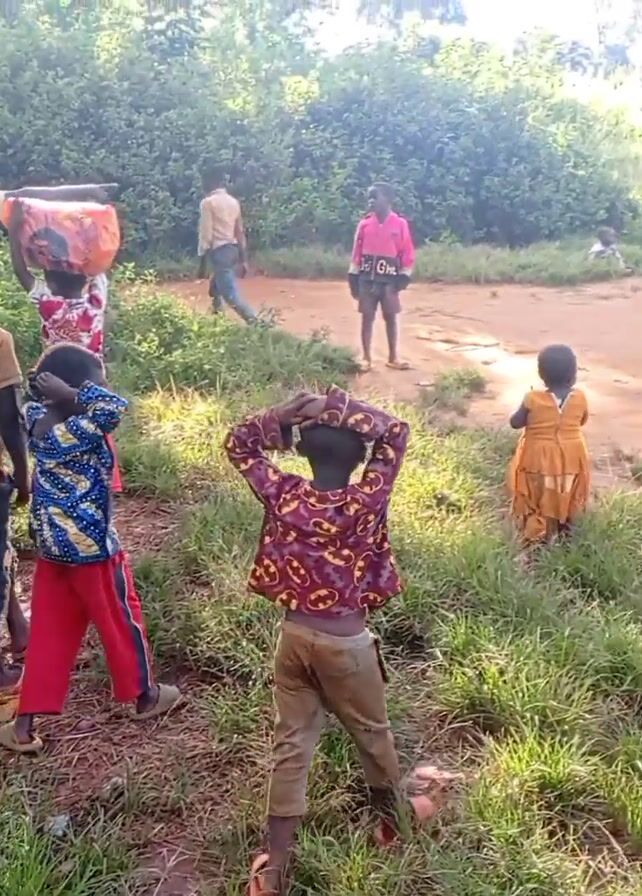 group of children standing in a grassy area near a dirt road. There are about 15 children of varying ages, mostly boys. Some are wearing shirts, while others are shirtless. Several children have patterned or brightly colored clothing. One adult male in a tan shirt appears to be instructing the group, pointing towards something off-camera. One child is carrying a large, possibly cloth-covered object on their head. The background consists of trees and dense foliage. The scene appears to be outdoors in a rural or semi-rural location during daylight hours.