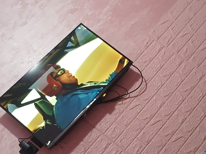 A tilted flat-screen television displays a pilot in a fighter jet cockpit. The pilot is wearing a red helmet, goggles, and a blue shirt. The background is yellow and blurred, suggesting movement. The television is on a pink brick-patterned wall. A power cord and adapter are visible near the bottom left corner of the TV, with other cables extending towards the right.