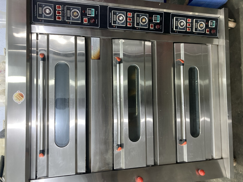 A stainless steel, three-door commercial oven is displayed