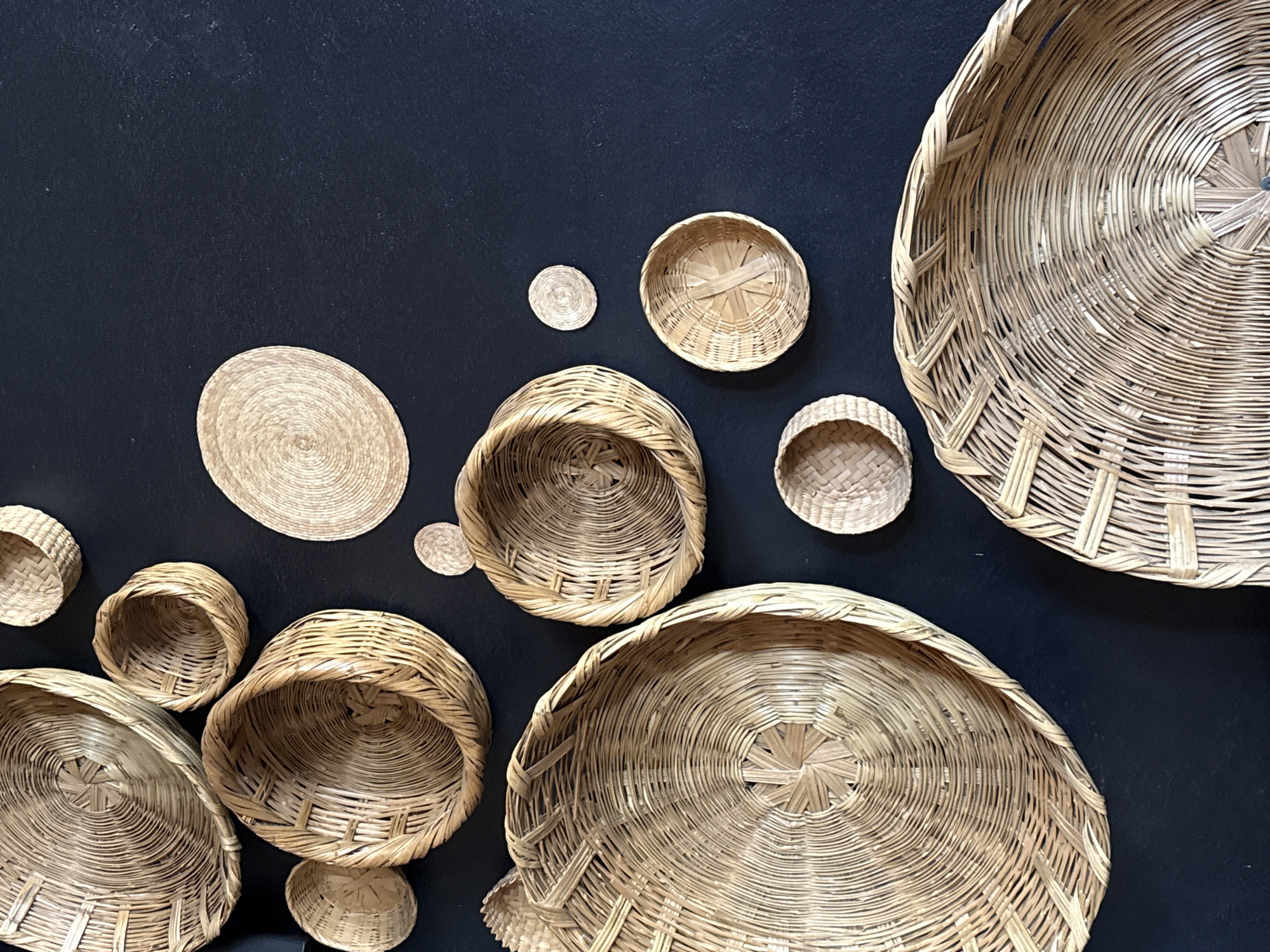collection of woven baskets of varying sizes and shapes arranged against a dark, possibly black, textured background
