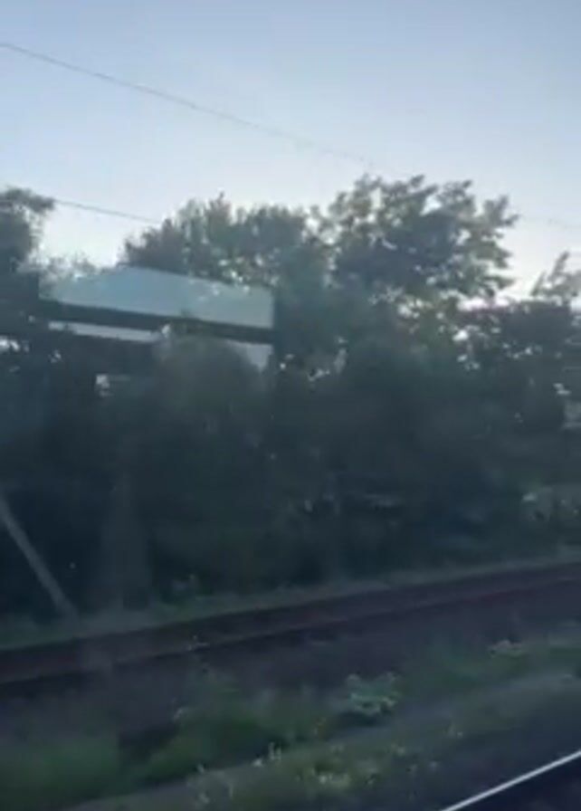 The camera is inside a train as it travels along the tracks. Outside the window, there are electrical poles and dense trees. A building is visible further off, with graffiti on its side. The sun shines brightly from behind the building, partially obscuring the details of the outside view.