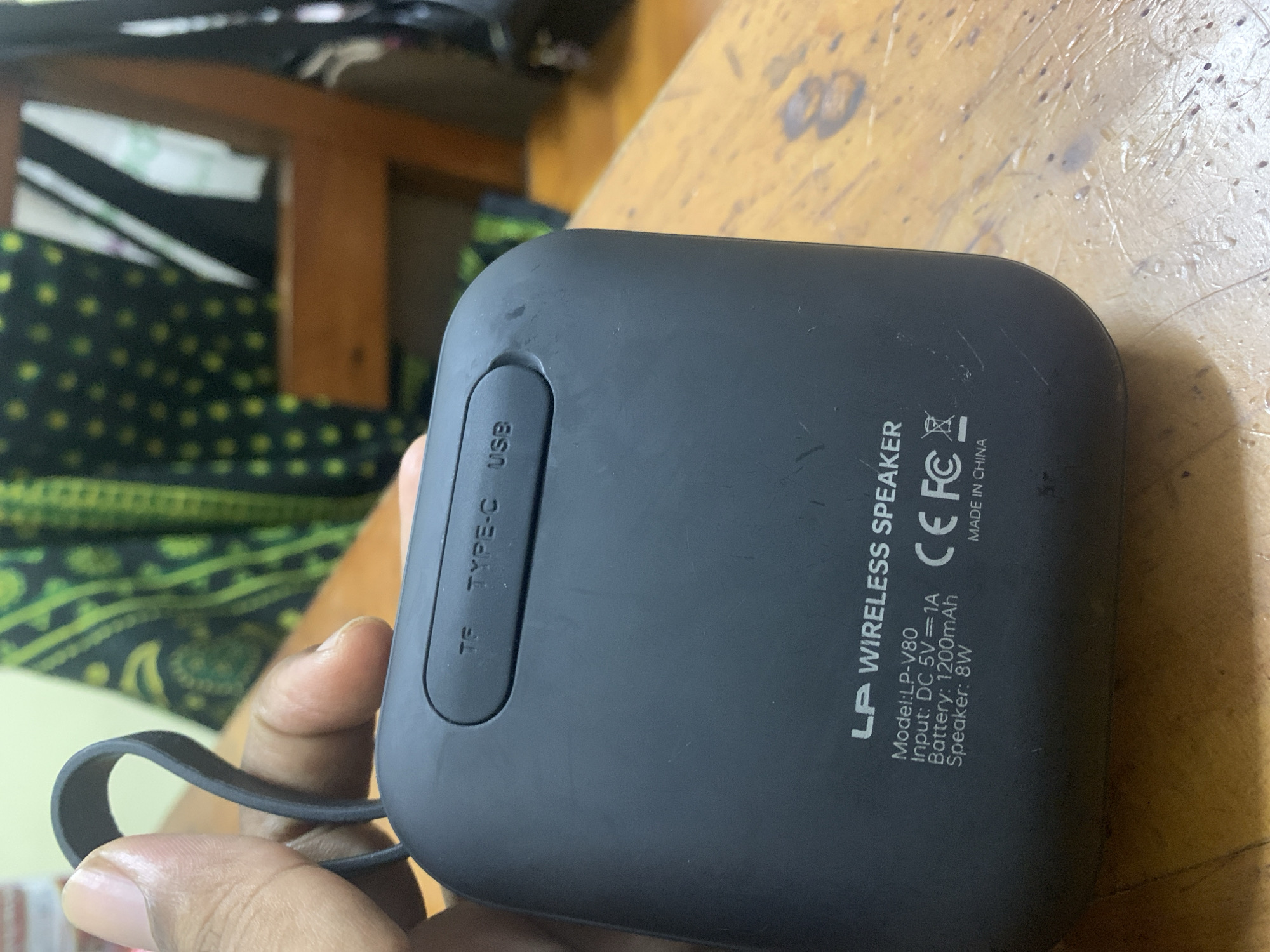 A hand holds a black LP-V80 wireless speaker, which features ports labeled "TF", "TYPE-C", and "USB"