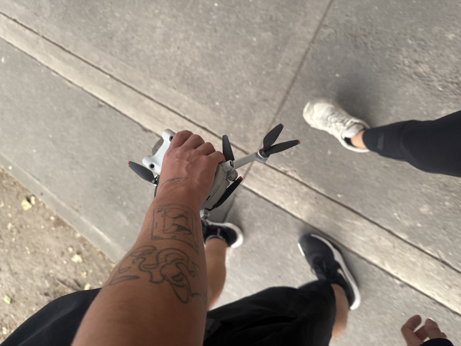 From a high angle, a tattooed arm holds a small, folded drone against a concrete sidewalk
