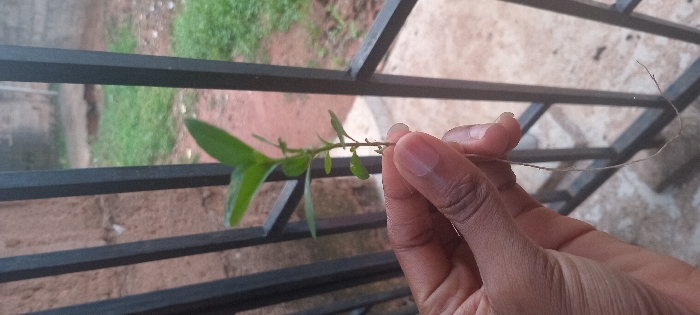 A hand holds a small sprig of green leaves and a thin, dry, curving stem