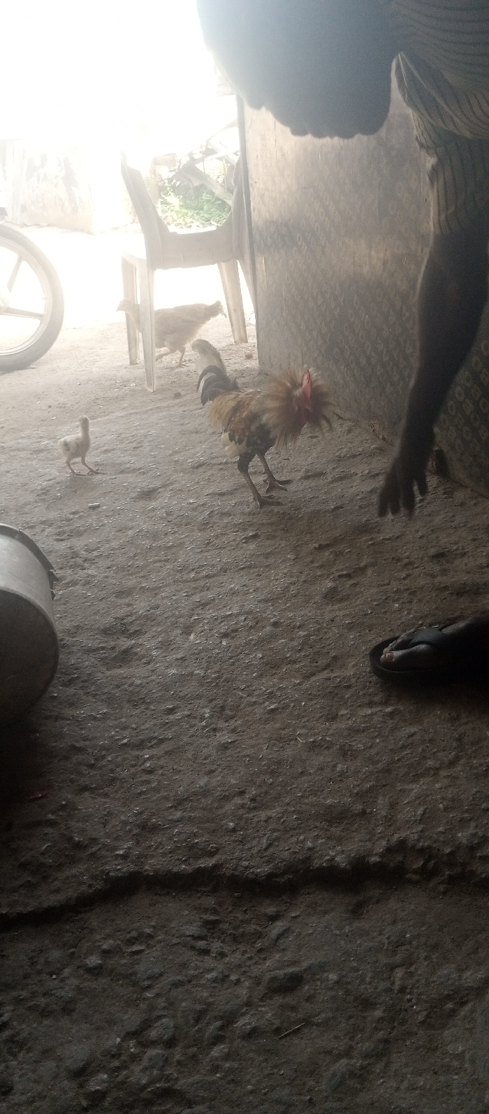 The image depicts an outdoor or semi-sheltered area in Adankolo, Nigeria, characterized by an uneven, packed earth ground mixed with small stones. On the right side, a person's dark-skinned right arm extends downward, fingers slightly splayed. Their right foot, wearing a black flip-flop, is visible on the far right at ground level. A portion of their upper torso, clad in a light-colored striped garment, is also present. In the mid-ground, a rooster with variegated brown, black, white, and red plumage, and a prominent red comb and wattle, stands facing towards the left. Directly to its left, a small, light-colored chick stands on the ground. Further into the background, two additional light-colored chickens are visible near and behind a white plastic monobloc chair. The front wheel of a motorcycle or bicycle is partially visible on the far left. A dark, vertical, textured panel, possibly made of wood or pressed board, forms a boundary on the right side of the scene. The background on the left is brightly illuminated by direct sunlight, overexposing portions and revealing distant green foliage. A metallic cylindrical container is partially visible in the bottom-left corner.