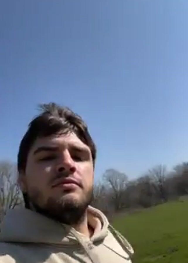 A young man stands in a grassy field, taking a selfie video. He has dark hair and a beard, and is wearing a tan hooded sweatshirt. The sky is clear and blue. In the background, there are trees and a goalpost. The man is looking at the camera, and the camera is moving slightly as he holds it.