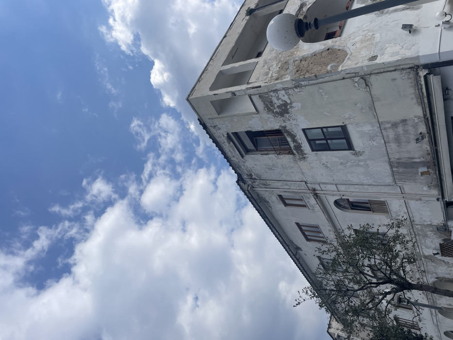 The image depicts a multi-story building located in Sorrento, Italy, viewed from a low angle on a partly cloudy day. The building features a light-colored, likely white or off-white, facade with extensive peeling paint, revealing darker plaster or stone beneath. Patches of grime and discoloration are visible on the lower sections of the walls. The building has multiple windows of varying designs. On the upper right, a window or doorway with dark framing is open inward, revealing a small, dark-colored wrought-iron balcony. Below it, a dark-framed rectangular window is closed. Further left on the same facade, several brown-framed rectangular windows are present. On a lower section, an arched window with a small railing is visible. The roofline is dark-tiled and partially visible against the sky. The right corner of the building shows recessed sections on the upper floors, forming open balconies or alcoves. One recess contains minimal vegetation. A tall, black streetlight post with a large, spherical white luminaire stands in the lower right foreground, partially obscuring the building's corner. On the left side, a tree with green foliage and dark branches partially covers the lower-mid section of the building. A light-colored awning is visible along the very bottom of the building's facade, suggesting commercial activity at street level. The sky occupies the upper portion of the image, displaying a clear blue with scattered white cumulus clouds. No individuals or vehicles are present in the frame.
