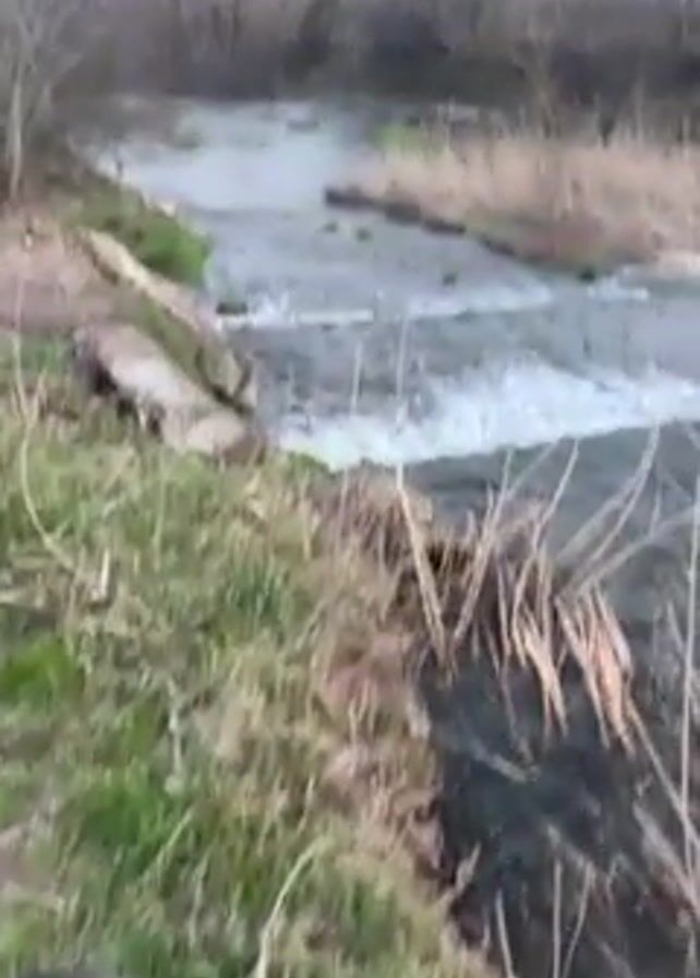 The video opens with a grey and white dog sniffing the ground near a small stream. The camera then pans up to show the stream flowing over a series of small waterfalls. The surrounding area is covered in grass and reeds, with a few bare trees visible in the background. The sky is cloudy, with a hint of color at the horizon. A power transmission tower can be seen in the distance.
