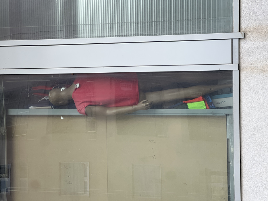 This image depicts a commercial storefront in Budva, Montenegro, viewed from an exterior perspective. The primary subject is a male mannequin, dark-skinned and partially visible from the upper back down to the mid-thigh, positioned upright within a glass display window. The mannequin is oriented away from the viewer and is dressed in a plain, short-sleeved red t-shirt. A small white security tag or electronic device is affixed to the back of its neck. Within the display space behind the mannequin, additional clothing items are discernible hanging on a rack. Below the mannequin's waist, various colorful fabric objects, including items in neon green, orange, and blue, are stacked. The large glass panel of the display window exhibits significant reflections of a light-colored building located opposite, which features multiple windows, some with visible horizontal blinds. Handwritten markings, resembling "b - q" and "b - g", are also reflected on the glass, appearing on the facade of the reflected building. The display window is framed by white vertical and horizontal architectural elements. To the right of this main display, an adjacent window section is visible, fitted with light-colored horizontal blinds. The immediate foreground below the window reveals a textured, light-colored wall with faint vertical streaks of discoloration.