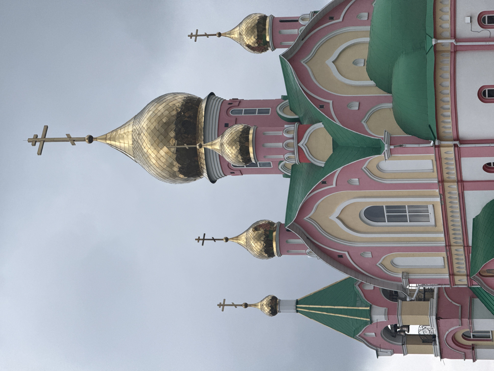 portion of the Church of the Icon of the Mother of God in Kurchatov, Russia. The church features colorful architecture with a pink and white facade, green roofs, and multiple golden domes topped with Orthodox crosses. The sky is overcast and grey.