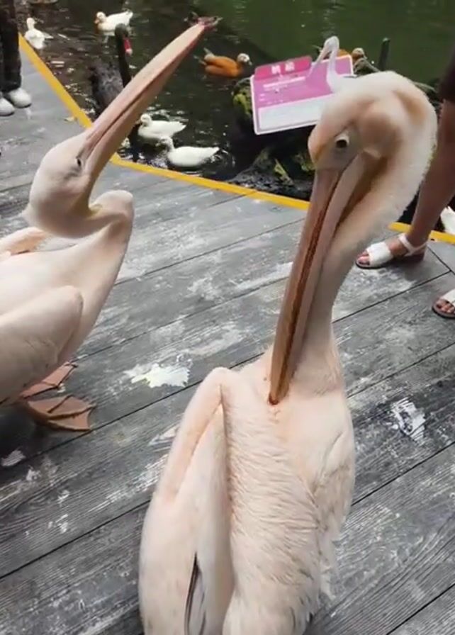 Two Great White Pelicans are shown standing on a gray wooden deck. The pelican on the right is grooming its neck feathers with its beak. The pelican on the left also has its neck bent and is grooming. In the background is a body of water containing various ducks and one black swan. Some people are standing around on the deck, including one visible wearing sandals. A pink sign stands between the pelicans and the water.