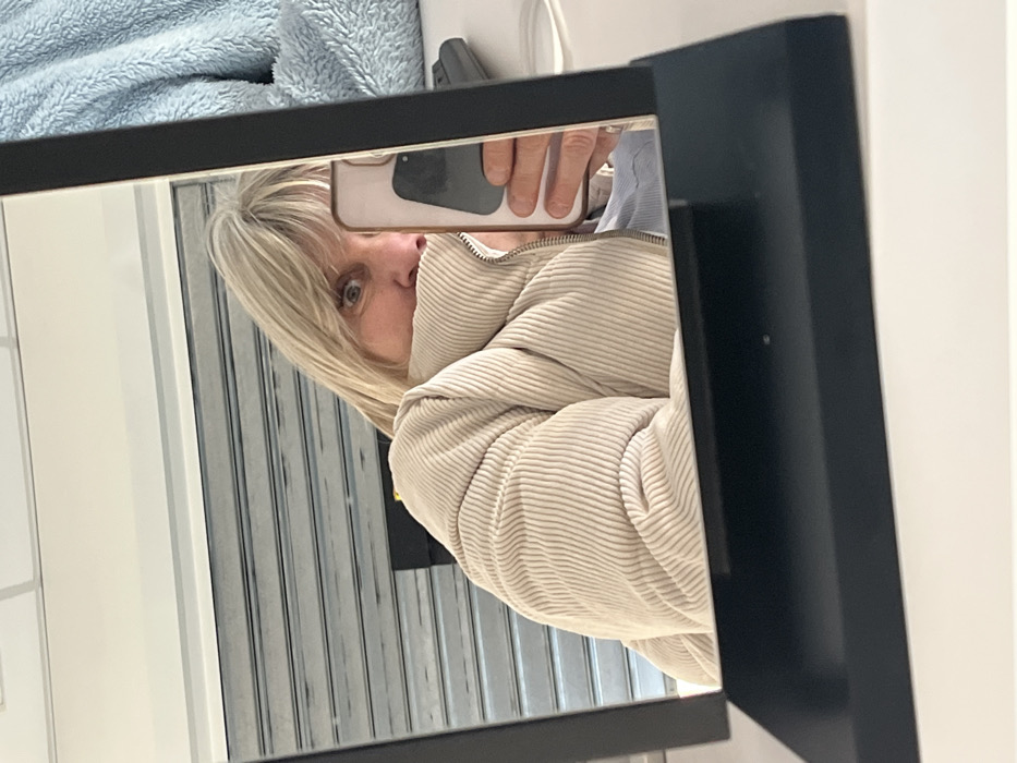 A woman with blonde hair is reflected in a mirror, holding a smartphone with a visible case. She is wearing a beige corduroy puffer jacket, zipped up high. The mirror has a black frame and reflects what appears to be a wall with vertical metal panels or blinds. The background includes a glimpse of a light blue blanket.
