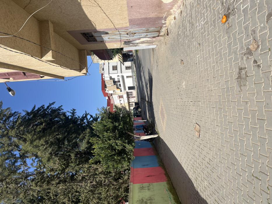 The image depicts a daytime street scene in Ksar-el-Kebir, Morocco, under a clear blue sky. The perspective is from a sidewalk looking down a paved street that curves slightly right and inclines uphill. On the left, a sidewalk paved with grey interlocking concrete blocks runs alongside a wall. This wall is painted with alternating vertical stripes of green, light blue, pink, and dark blue. Behind the wall are several tall, dense evergreen trees. A smaller, leafy green tree with a pale trunk stands on the sidewalk near the wall, casting a shadow. A black motorcycle or scooter is parked behind this tree. Several dried brown leaves and a piece of crumpled cardboard are scattered on the sidewalk. On the right, a multi-story building with a pale yellow/beige facade dominates the foreground. An upper-story window features a brown shutter, and a grey streetlamp extends horizontally from the building. Black electrical wires run along its exterior. The ground level section of this building has a weathered light brown/pink base and a closed, aged, light blue-grey metal double door with vertical bars and visible rust. The sidewalk on this side is also paved with grey interlocking concrete blocks, showing similar dried leaves and an orange, round object (likely fruit peel) in the immediate foreground. In the middle ground and background, the street is paved with asphalt. A dark-colored car is parked on the left side of the street. Beyond the street, a cluster of residential buildings is visible, primarily white and beige with some red roof elements. Notably, several patterned rugs or textiles are hanging over a balcony railing on a white building to the right of the street. No individuals are visible in the scene.
