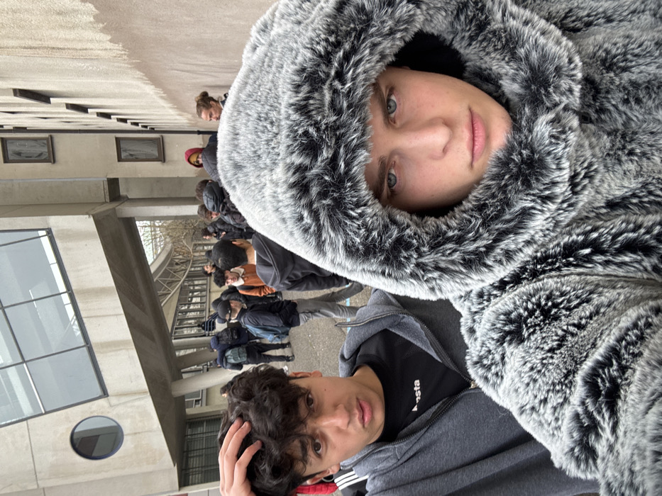 The image depicts a crowded outdoor scene on the Esplanade campus of the University of Strasbourg, France, featuring a group of young people. In the immediate foreground, a young male occupies the right side, wearing a prominent black and grey faux fur-lined hooded jacket. He has light blue eyes and maintains a direct, neutral gaze toward the camera. To his left, partially visible, is another young male with dark, curly hair, who is touching the top of his head with his right hand. He wears a dark grey zippered hoodie over a black t-shirt displaying "nsta" text. His expression suggests mild inquiry. In the mid-ground and background, approximately fifteen to twenty other young individuals are casually gathered, dressed in various winter or transitional garments including jackets, hoodies, and backpacks. The architectural environment consists of modern, concrete university buildings. To the left, a multi-story structure is visible with distinctive angled glass window sections, a circular window, and an elevated concrete walkway. To the right, a lighter-colored building wall with several rectangular windows is present. The ground is paved. The sky is overcast, indicating a cloudy daylight setting.
